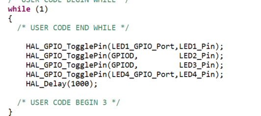 7. int main(void)에서 while 문에서 HAL_GPIO_TogglePin과 HAL_Delay를 적당히 사용한다.
