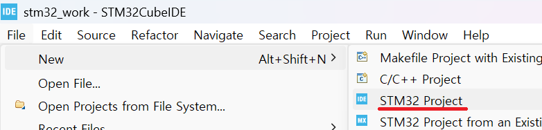schematic에서 확인하였으니 stm32cubeIDE에서 프로젝트를 생성한다.